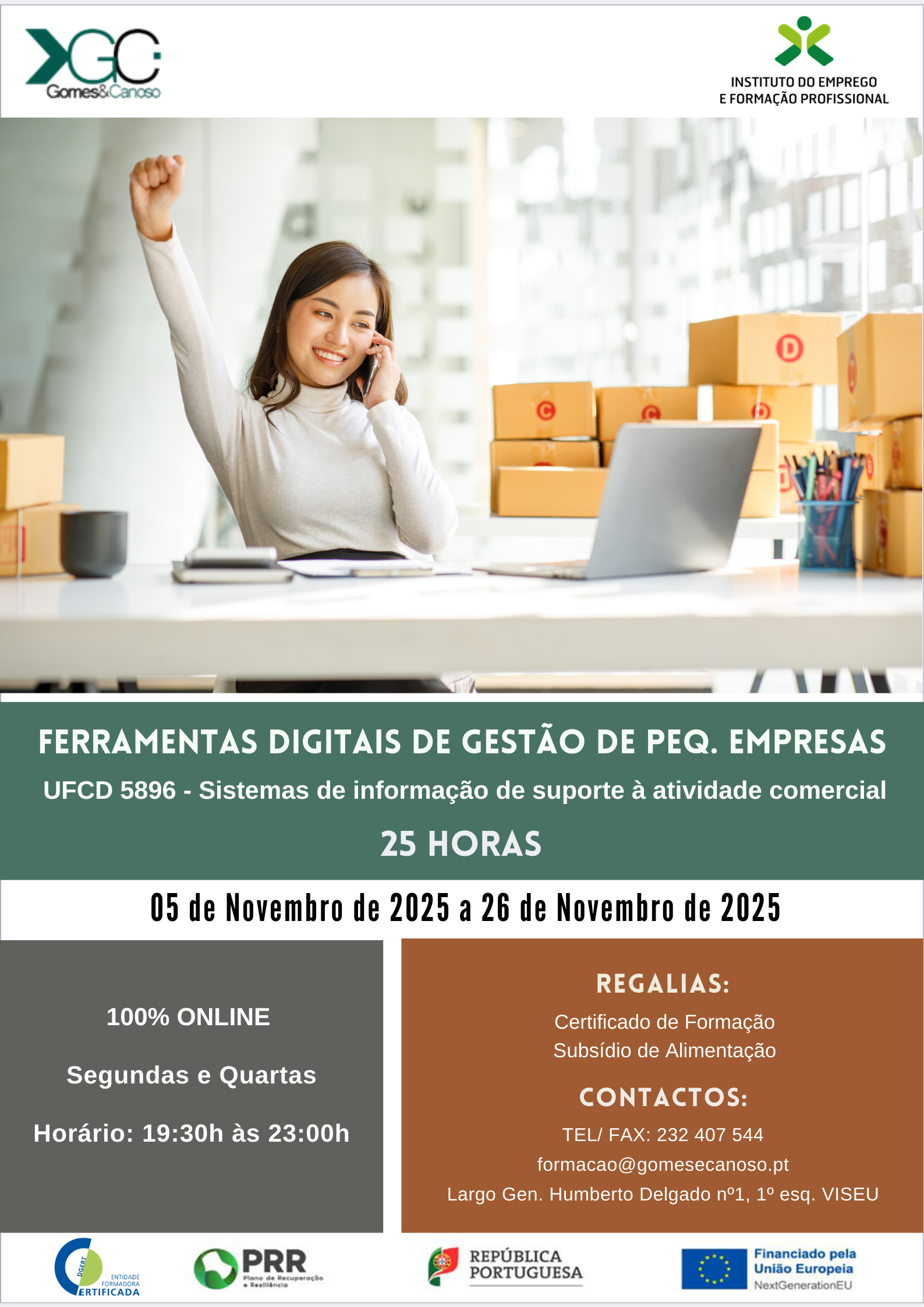 Qualidade de Vida do Idoso: percurso formativo certificado de 25 Horas. Formação online e com direito a subsídio de alimentação no valor de 4,77€/dia. Decorre às segundas e quartas, das 19h00 às 22h30. Início a 14 de Novembro! Para empregados com, no mínimo, o 9º ano e desempregados não DLD com, no mínimo, o 12º ano. Inscrições limitadas! Aceitam-se inscrições das regiões Norte, Centro e Alentejo. Inscreva-se já através de 926419023 ou formacao@gomesecanoso.pt
